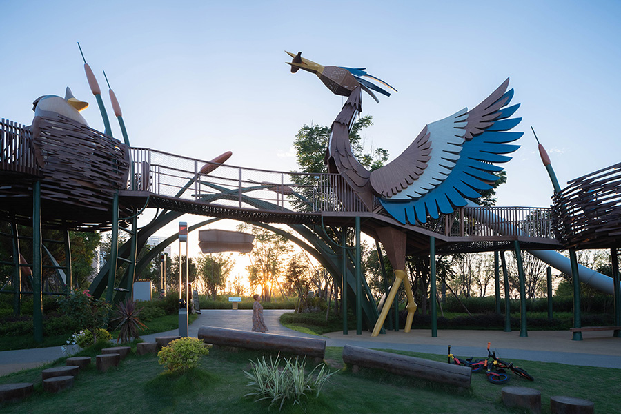 设计团队以儿童乐园动植物形象为设计依据,将苍鹭、红嘴鸥、青头潜鸭、叉尾太阳鸟、菖蒲等动植物放大形成主要观景拓展塔群,为成都营造出了一片丽水润泽百草茵,诱来雁鹤盘空鸣的自然意境。