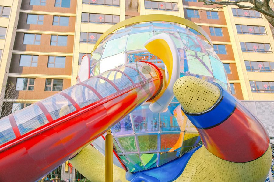 大圣主题儿童游乐场地,整个场景还原西游记元素,整个主设备做成孙悟空的形象,模拟大圣取金箍棒的画面,做成滑梯样式,让孩子们在大圣的身体里游玩,整个场景从墙绘到IP的西游脸谱化,无一不体现西游的冒险精神。该项目主要采用的是孙悟空的IP形象打造的社区儿童乐园,让孩子们沉浸其中,而且还配备了筋斗云摇马和儿童秋千
