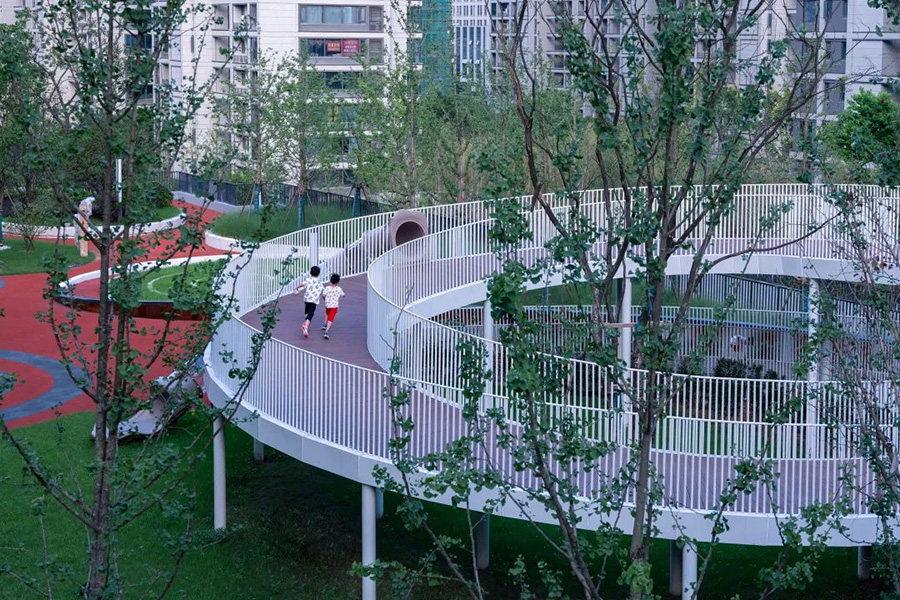 核心宅间区域致力于打造社区假日会客场所,设计团队基于社区生活基本诉求,充分了解当代都市人生活审美意趣,通过设置休憩廊架、镜面水景等一系列景观节点满足使用者对于诗与远方的美好想象,承载闲暇假日时光。