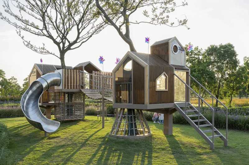 结合大区学校的特点,团队在场地里打造花田树屋,原木质感掩映在花田之中,儿童通过玩耍习得团结、合作、勇敢的精神。开工时间:2022年-10月 竣工时间:2022年12月